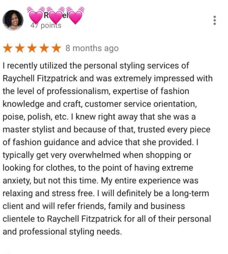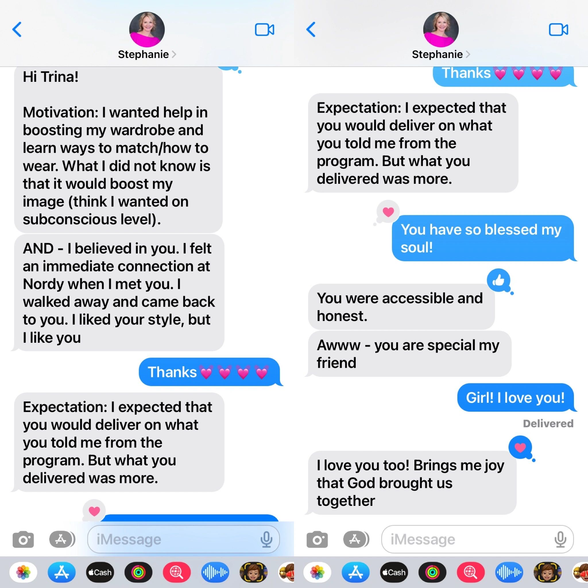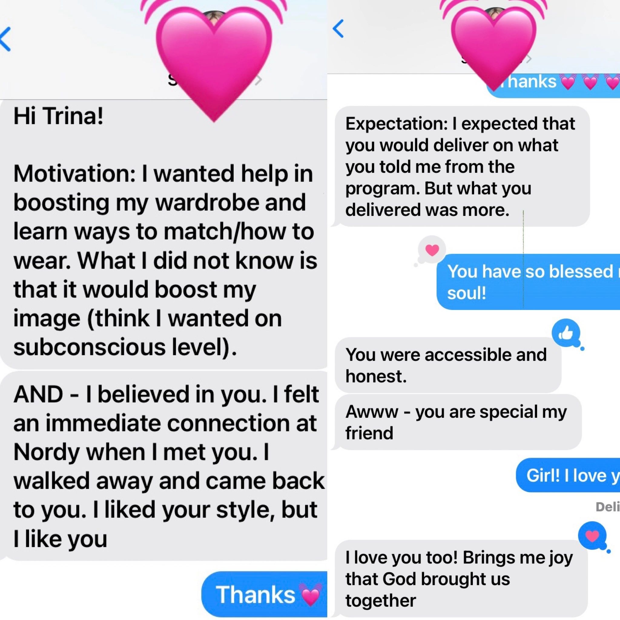 I wholeheartedly recommend 'Trina The Style Consultant' to anyone seeking a transformative style journey. Trina is not just a style consultant; she's so much more, she’s someone who can turn your fashion dreams into reality." Believe that. ~Susan H. 9/2023